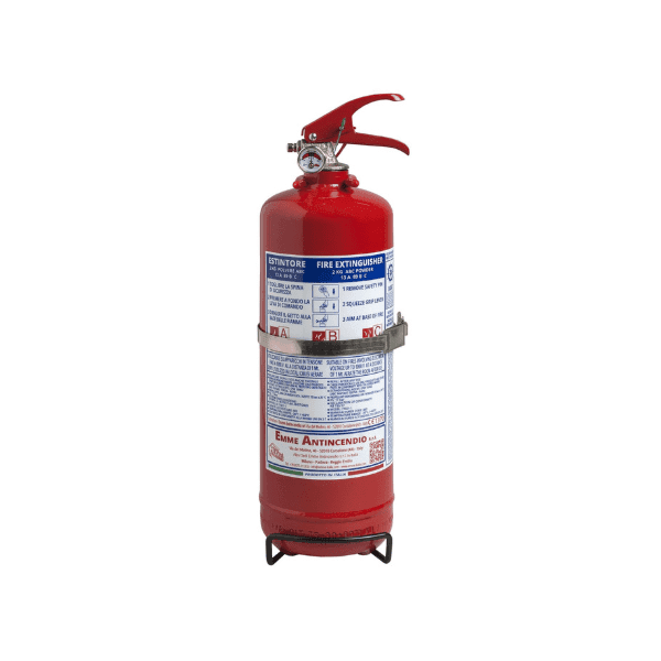 Estintore a polvere da 2 Kg , temperatura di utilizzo da -30°C a +60°C, costruito in accordo alla norma UNI EN 3-7 (D.M. 7.1.2005), approvato Marine Equipment Directive MED 2014/90/UE, certificato secondo la direttiva per attrezzature a pressione PED 2014/68/UE, realizzato in conformità ai controlli di produzione secondo norma EN 3-10.