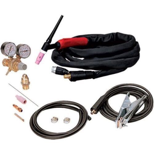 Composto da: adattatore per bombola, cavo di massa 25mmq 3mt + spina dinse, kit tubo gas + fascette, pinza di massa 300A, riduttore di pressione 2 manometri, torcia tig ST26 4m 220A 5P, elettrodo tungsteno ceriato+diffusore, elettrodo tungsteno puro, ugello + pinza serra elettrodo.